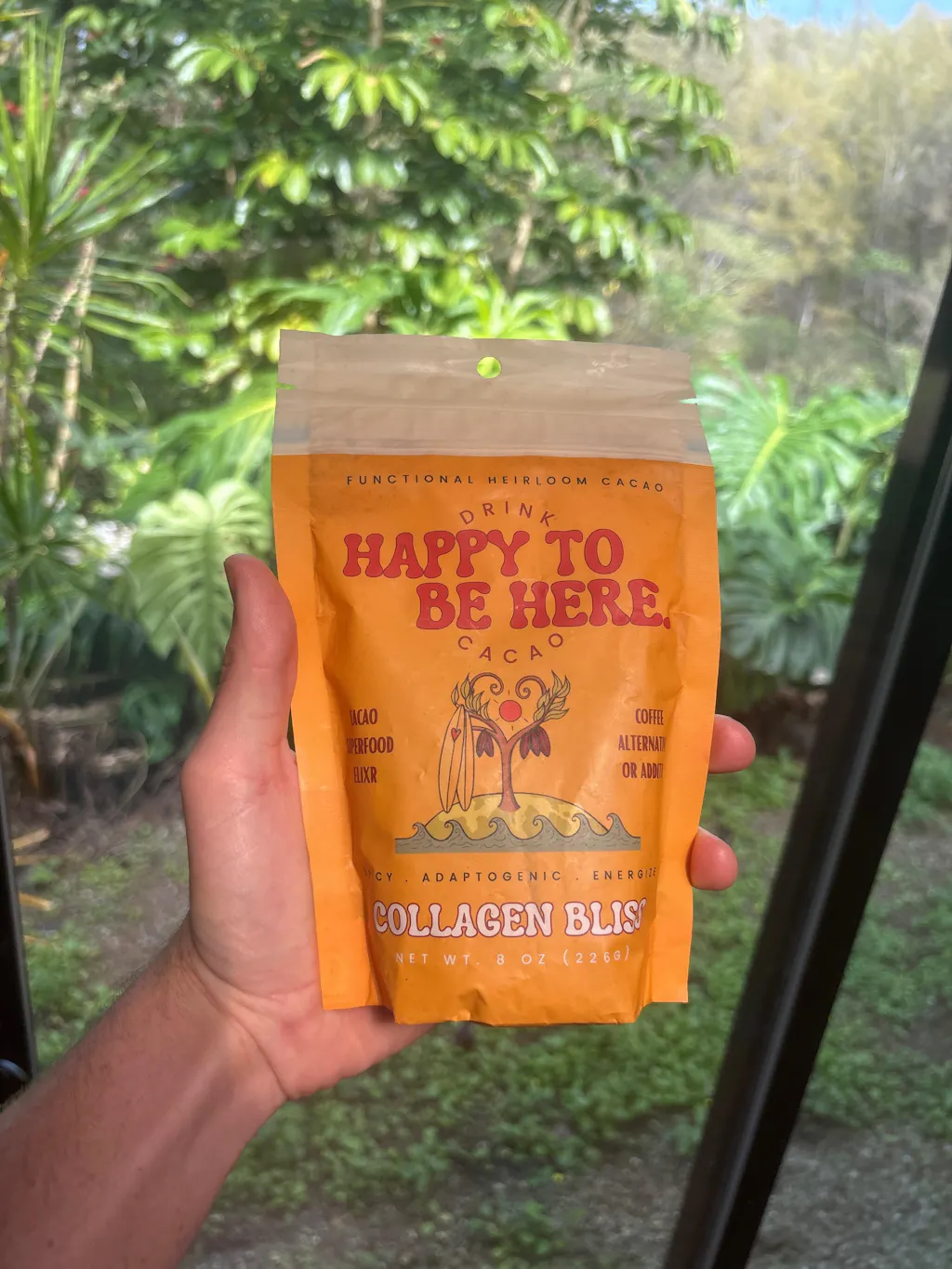 Collagen Bliss is a functional cacao blends that includes collagen, turmeric, red maca, ginger, cinnamon, cayenne, and mushrooms. It’s designed to support skin health, joints, digestion, energy, and mood—great for mid-morning or afternoon sipping.